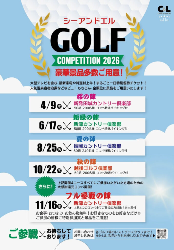 毎年沢山の御参戦ありがとうございます。昨年度も満員御礼!今年も開催いたします!C&L ゴルフコンペ2026のご案内です豪華景品多数、腕をふるって特選バイキングをご用意いたします。精一杯のおもてなしをさせていただきますので、皆様の御参戦をお待ちしております!